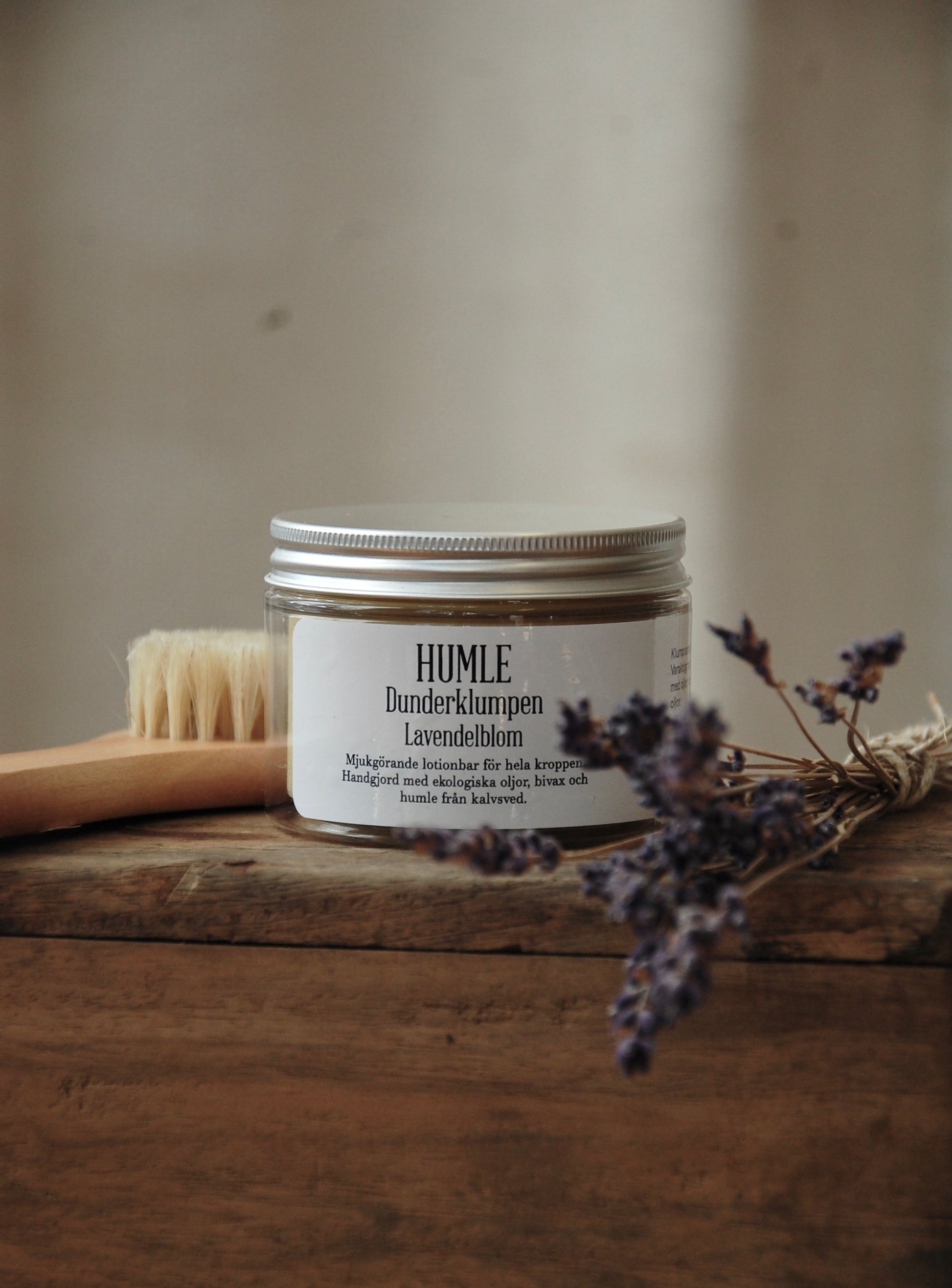 HUMLE Dunderklumpen Lavendelblom är just vad den heter, en klump som gör dunder för huden. En mjukgörande lotionbar för hela kroppen som både mjukgör, återfettar, återfuktar och skyddar normal, torr och känslig hy. Den ger din hud en naturlig lyster och mjuk varaktig känsla! Finns i två olika varianter; Med en blommig ljuvlig doft av lavendelblom.